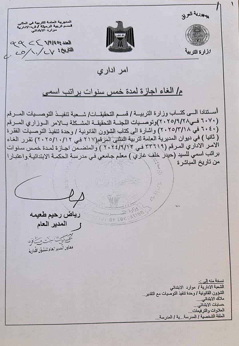 ابلغ الصحفي حيدر الحمداني الرأي العام، اليوم الاربعاء، قيام وزارة التربية بالغاء اجازته الرسمية لخمس سنوات، التي طلبها للتفرغ لعمله الصحفي.