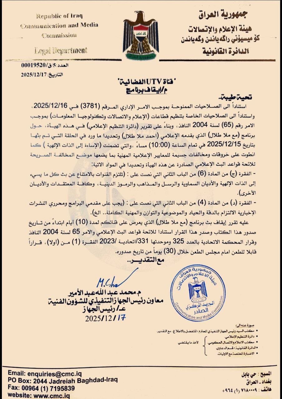 قررت هيئة الاعلام والاتصالات، ايقاف برنامج “مع ملا طلال” لعشرة ايام بحجة “مخالفة لوائح البث الاعلامي”.