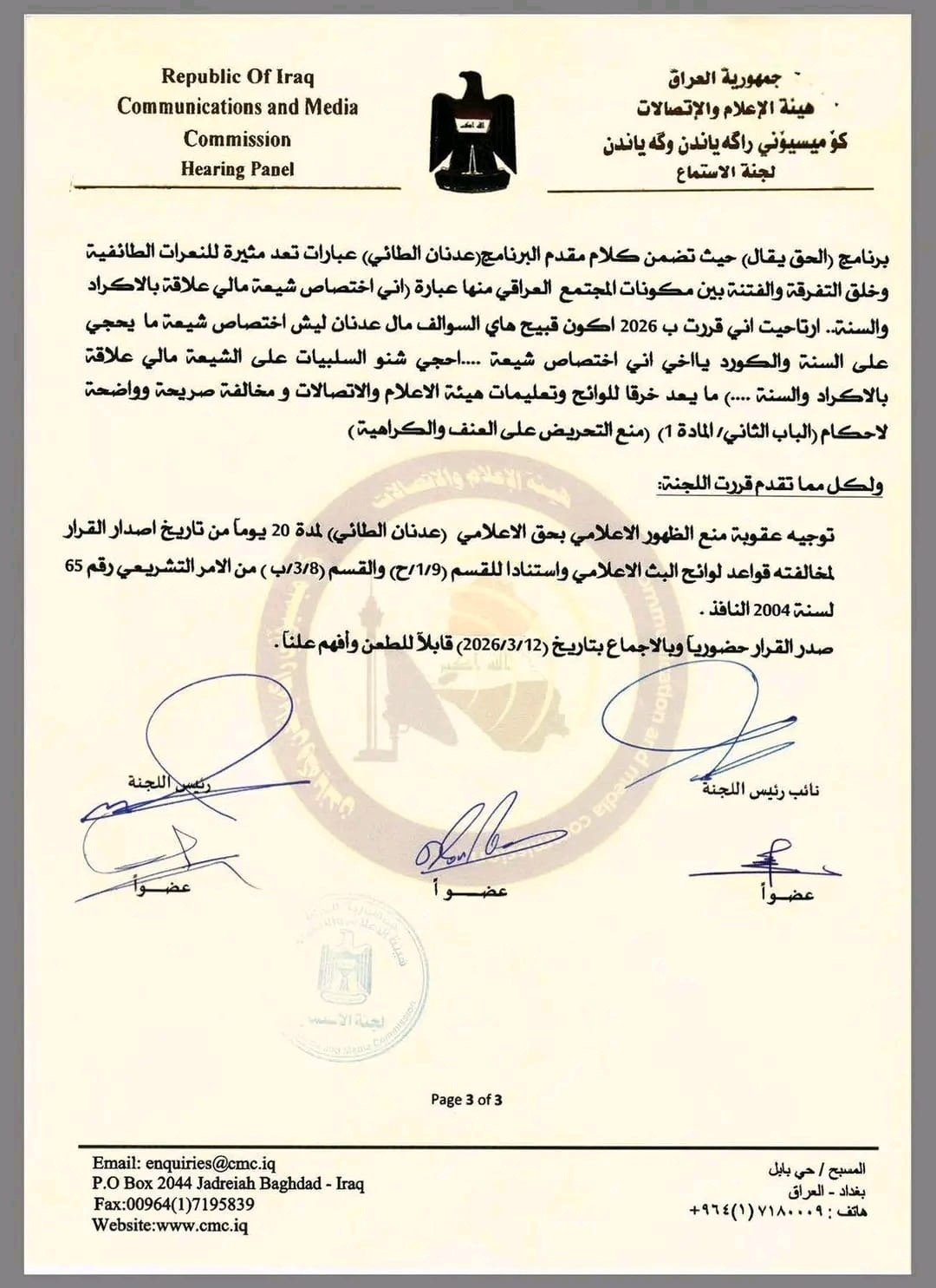 واظهرت وثائق صادرة من هيئة الاعلام والاتصالات، تنص على منع ظهور مقدم برنامج الحق يقال عدنان الطائي لمدة 20 يوماً، بحجة استخدام عبارات تثير النعرات الطائفية وتساهم في خلق التفرقة والفتنة بين مكونات المجتمع العراقي.