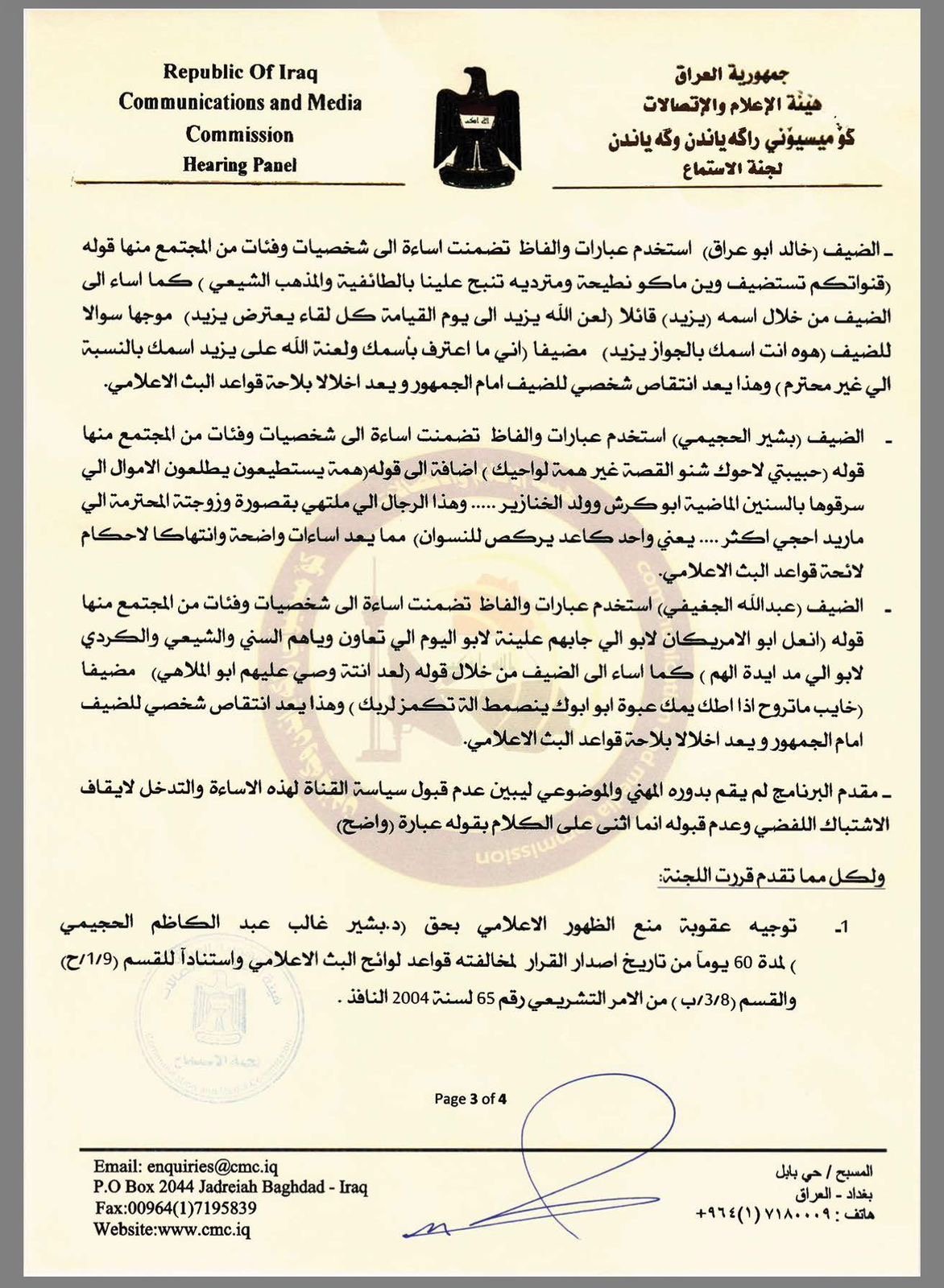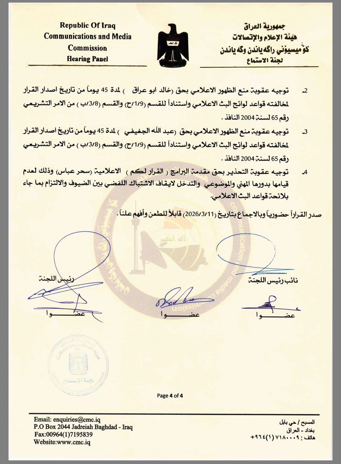 وفي ذات الوثيقة، قررت منع ظهور كل من ابو عراق والجغيفي لـ45 يوماً و الحجيمي لـ60 يوماً.