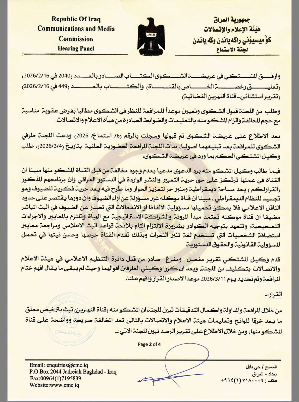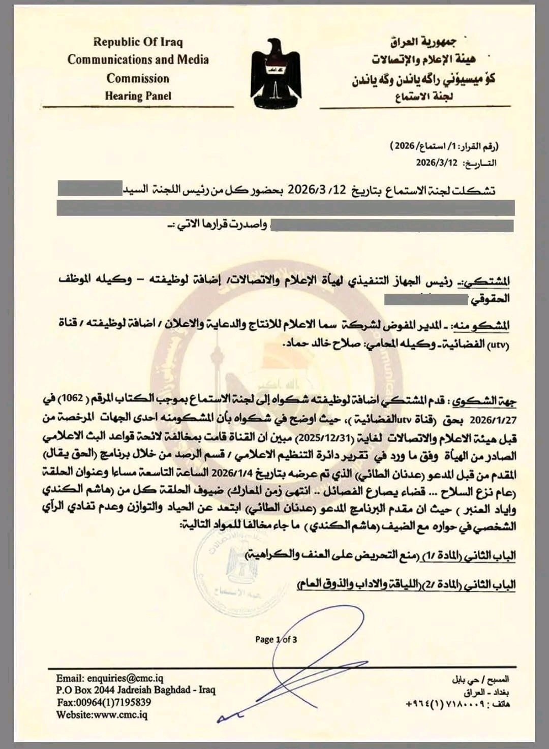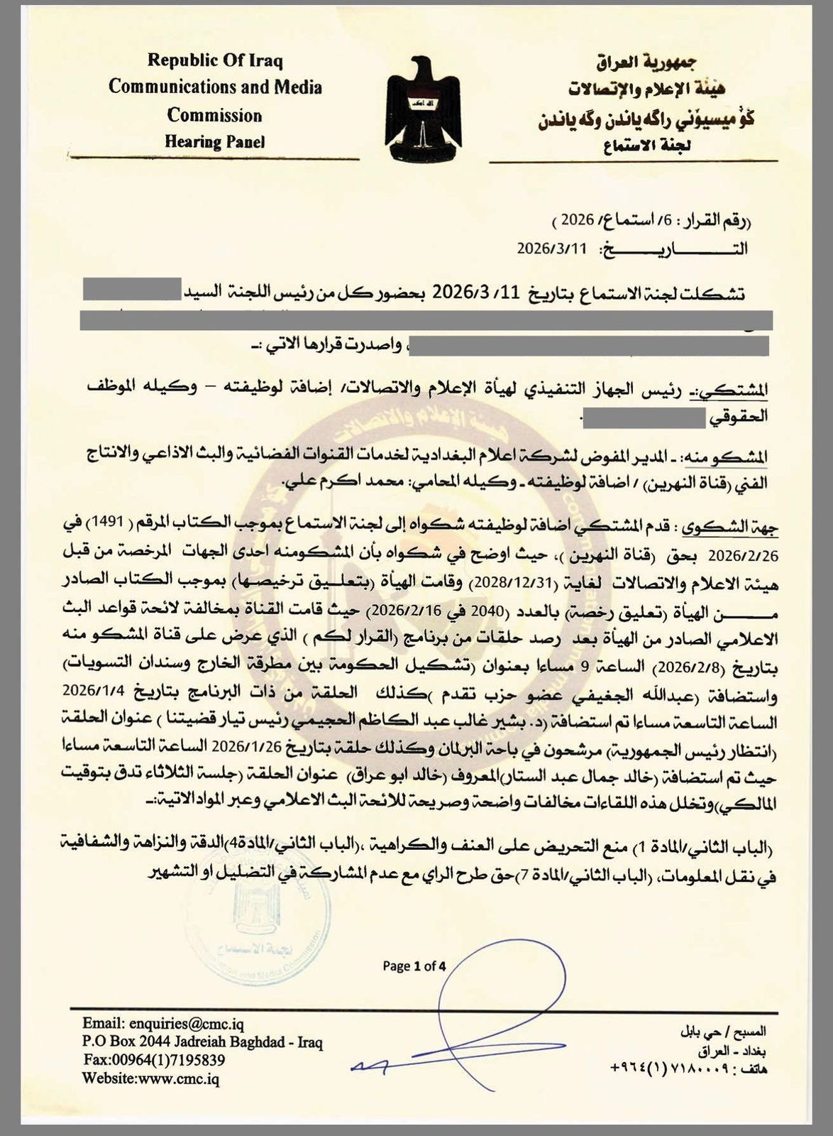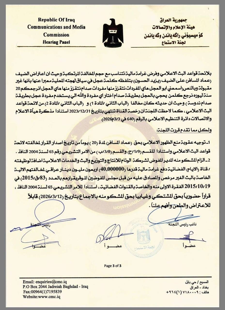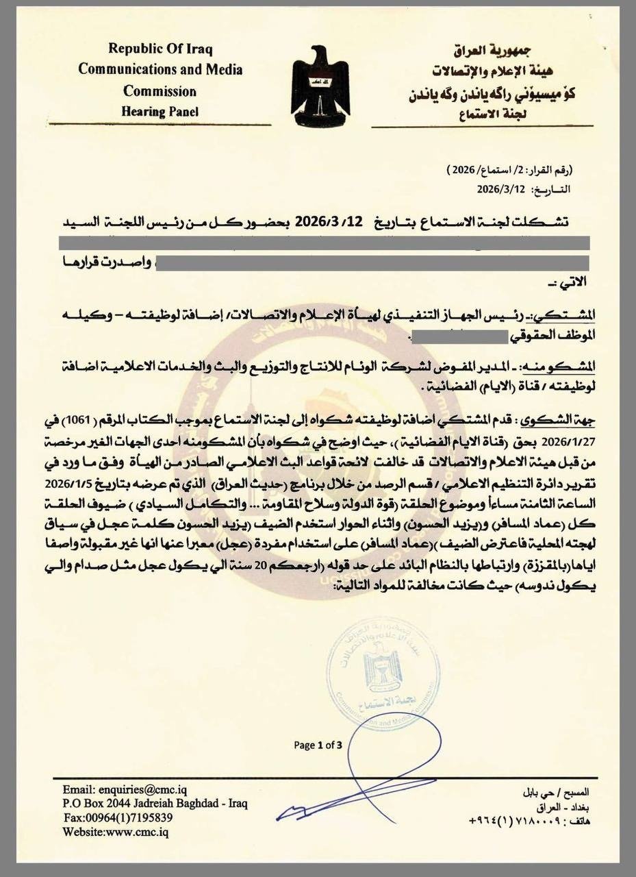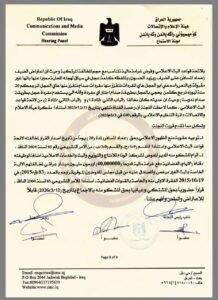 فيما وبخت هيئة الاعلام في وثيقة عقابية اخرى، مقدمة برنامج “القرار لكم”، سحر عباس جميل، بحجة عدم قيامها بدورها المهندي والتدخل لايقاف الاشتباك اللفضي بين السياسي بشير الحجيمي وعبد الله الجغيفي، والمحلل خالد ابو عراق.